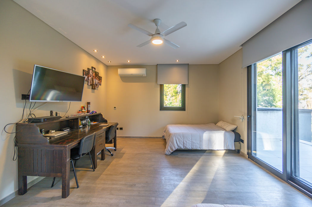 Planta Baja (Sector Social): amplio living comedor con toilette, cocina equipada con family y cuarto de huéspedes con baño completo. La cocina cuenta con muebles de alta calidad en bajo mesada y alacenas. Desde este sector, se accede a una galería semicubierta con vistas al parque y a la piscina.